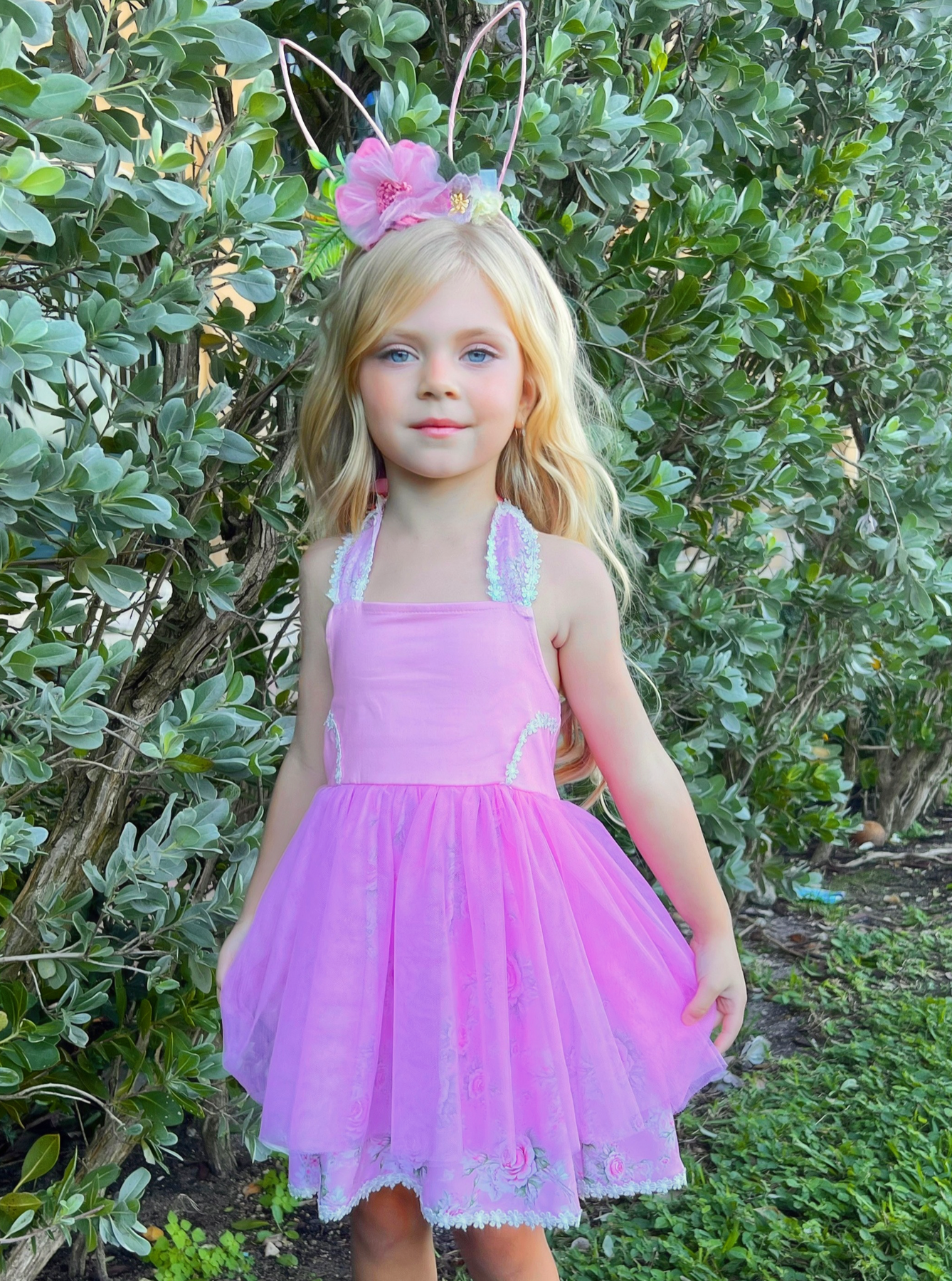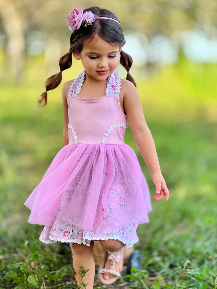 Pink tulle overlay dress with floral details