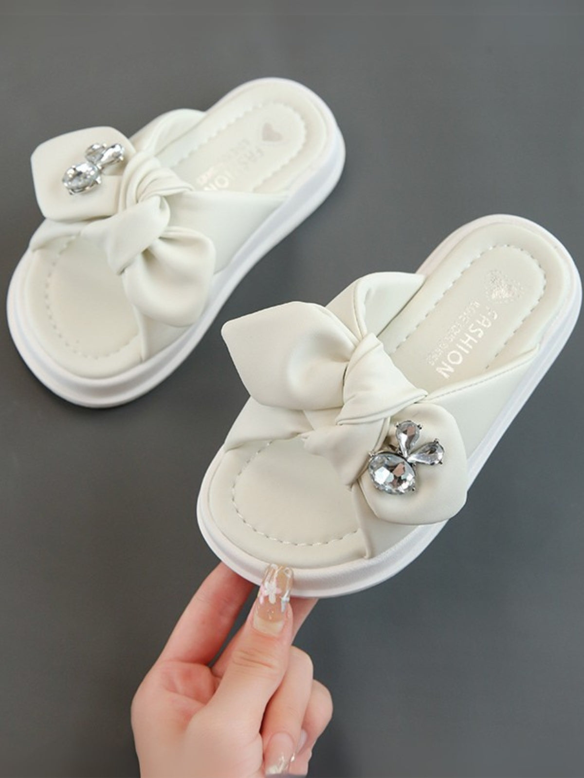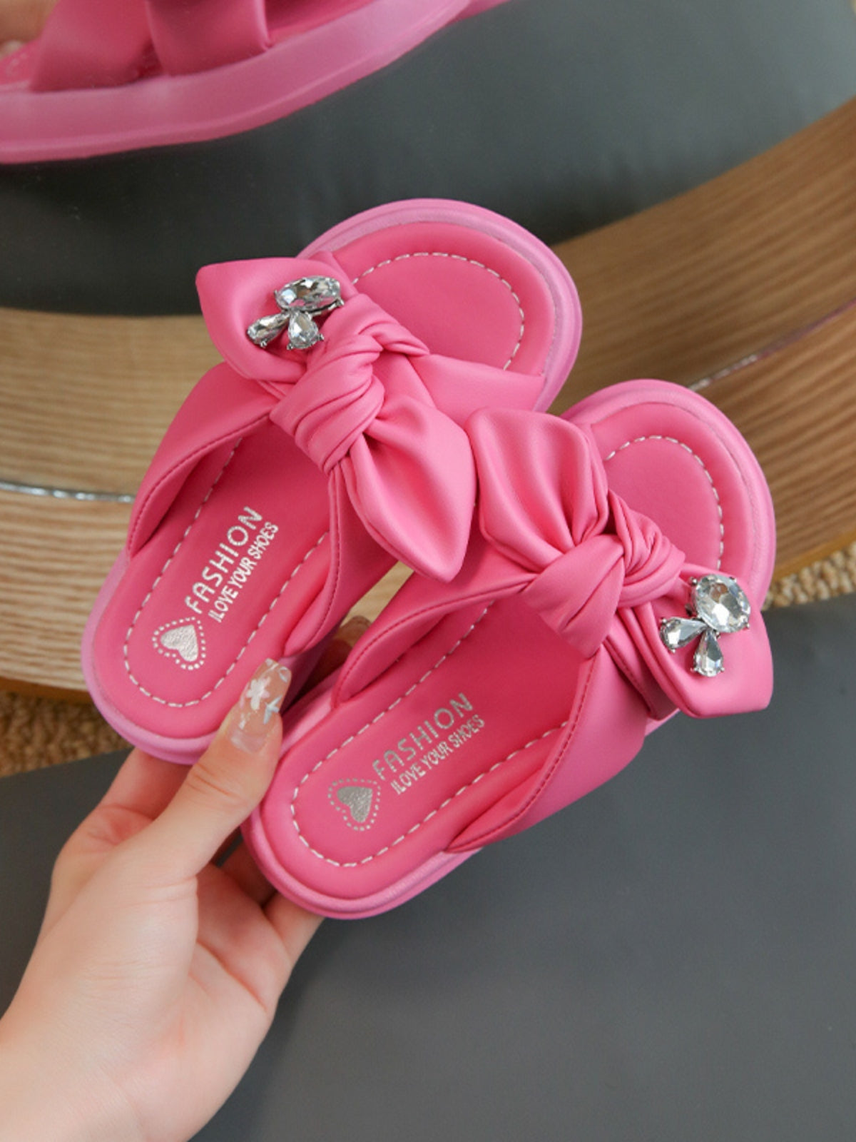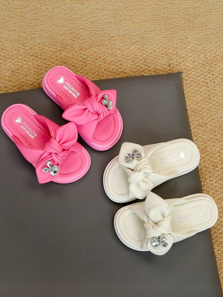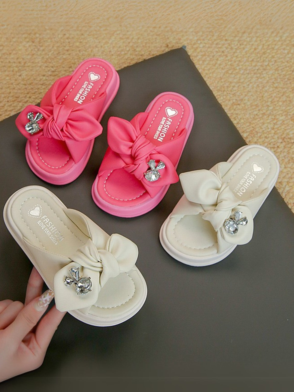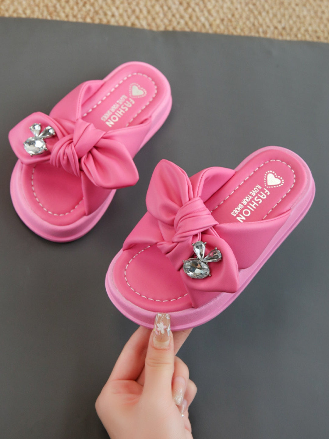 • Let your little one shine in these Girls Rhinestone Bow Slippers—a perfect blend of comfort and glam.