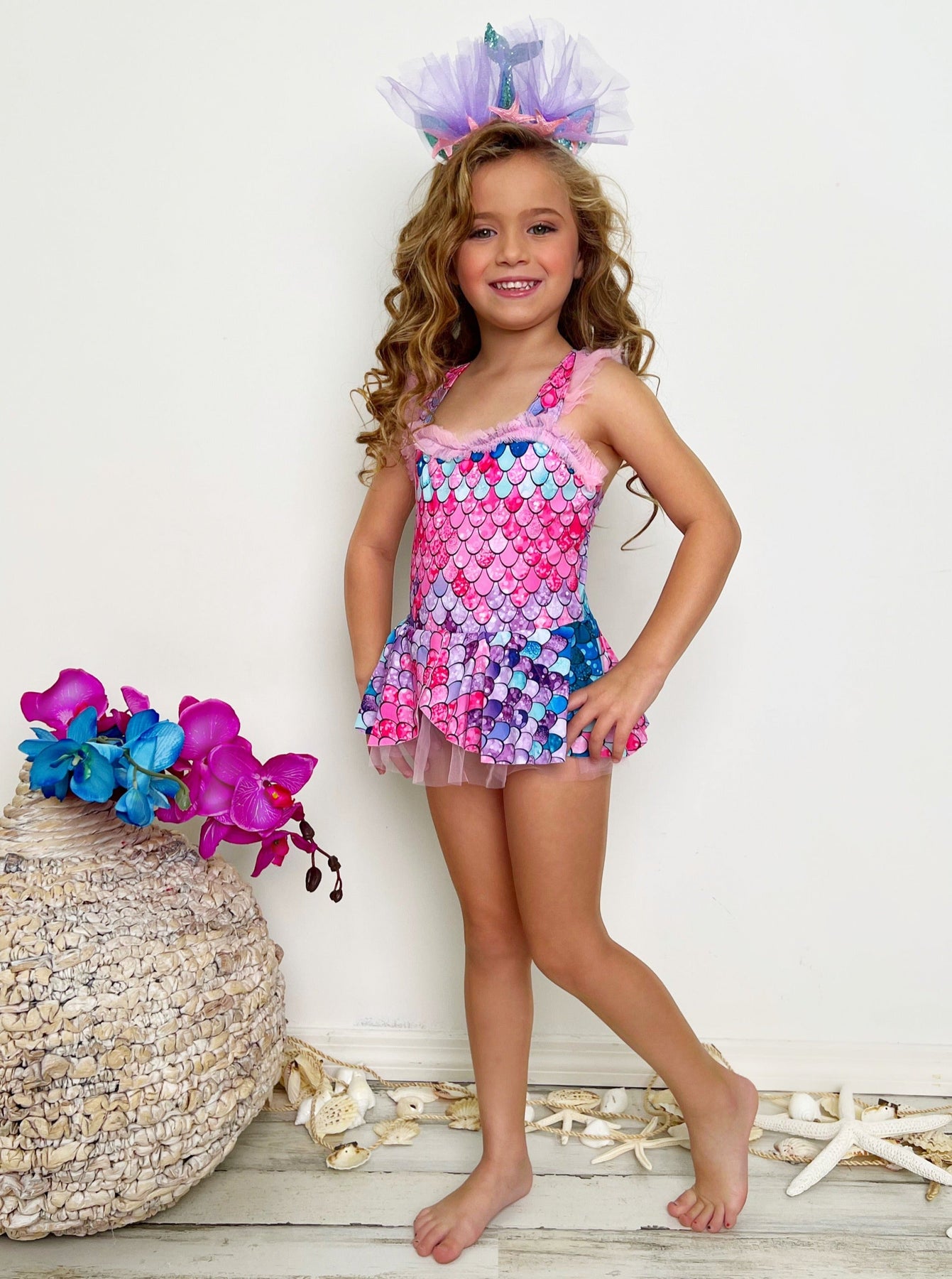 • This sweet one-piece swimsuit and your trendy toddler were MERMAID for each other! With frills and ruffles that look just as cute in the water as out, the skirted bottom makes it fun to twirl and spin like she has fins.