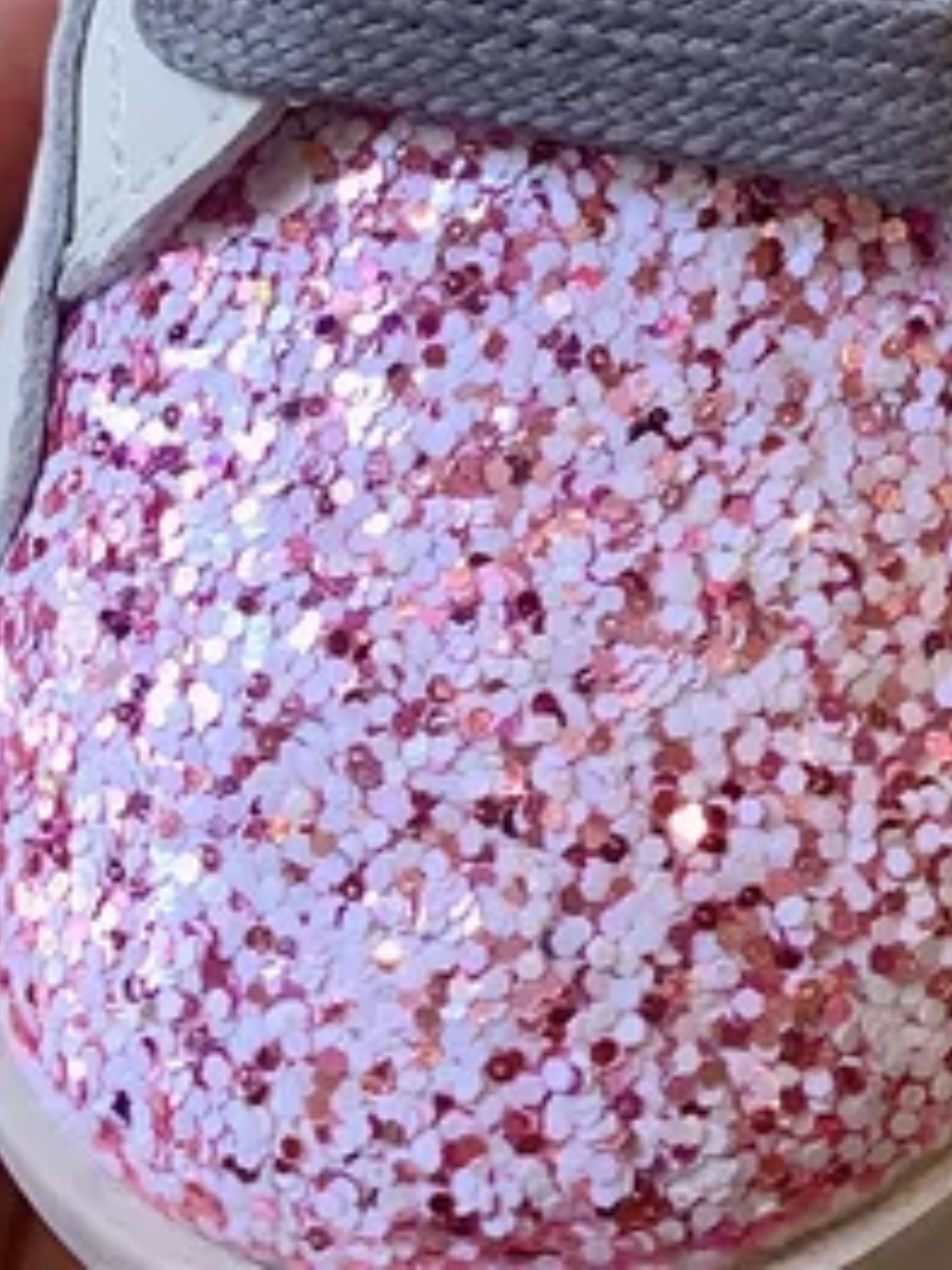 - Magical steps every day with our pink glitter sneakers for girls! Dazzling glitter covers the toe and side panel stars with eye-catching pink and white. Your little princess will have effortless shine and sparkle with every comfortable step of her new favorite shoes.