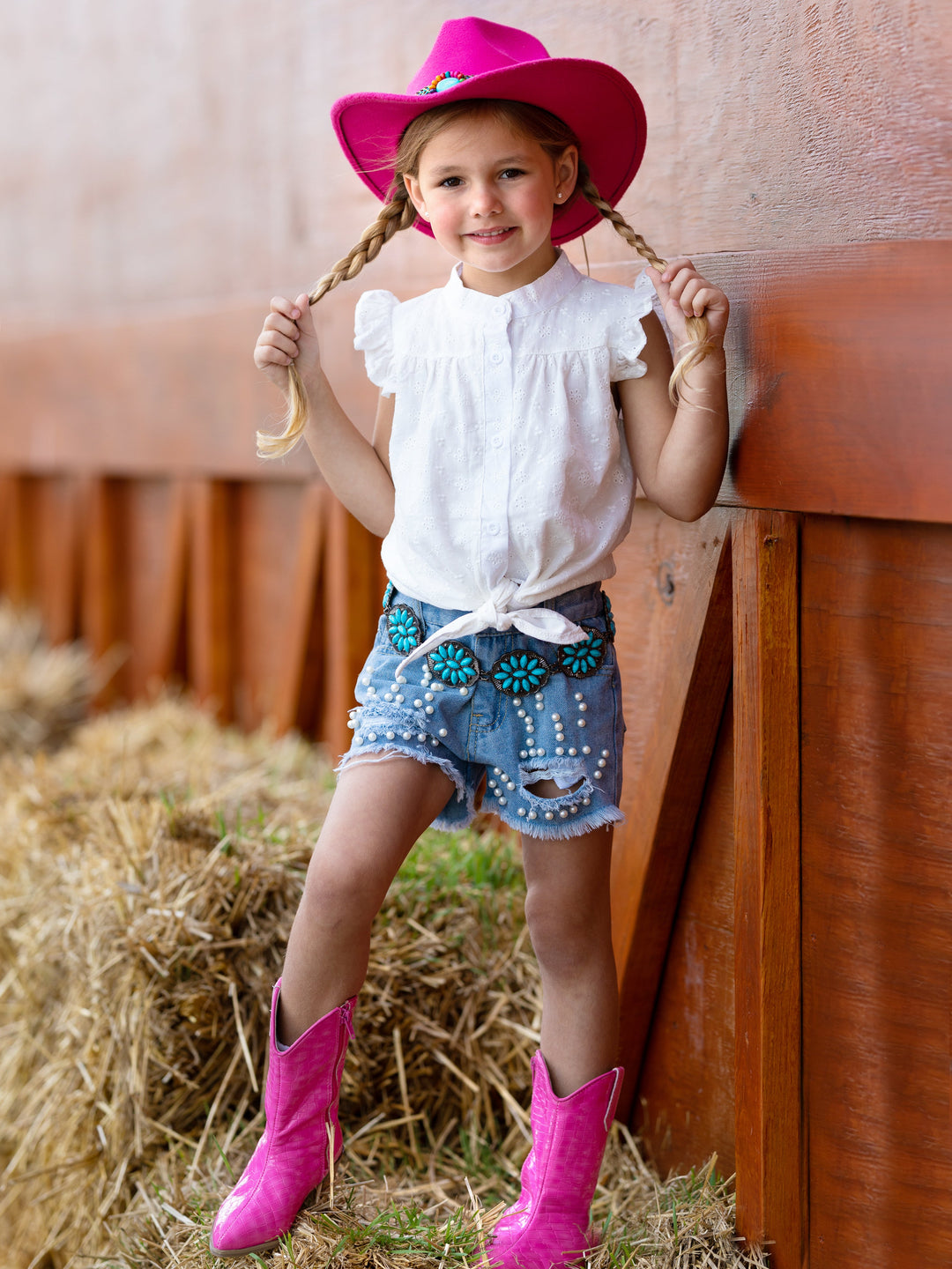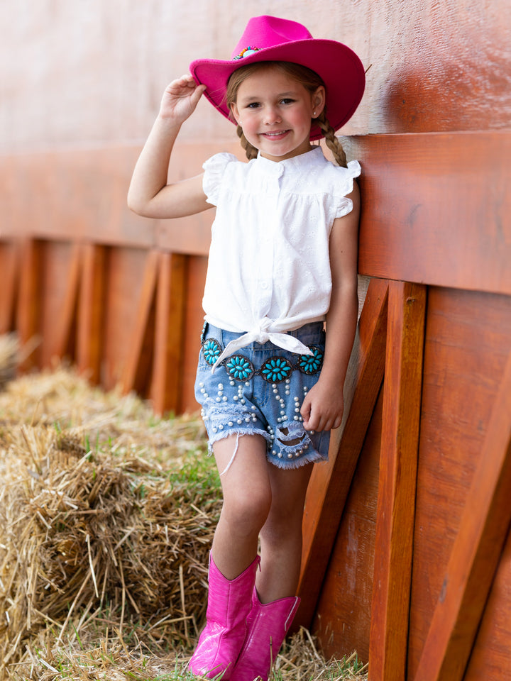 - Add a touch of royalty to your princess' wardrobe with this chic knot top and pearled denim shorts set.