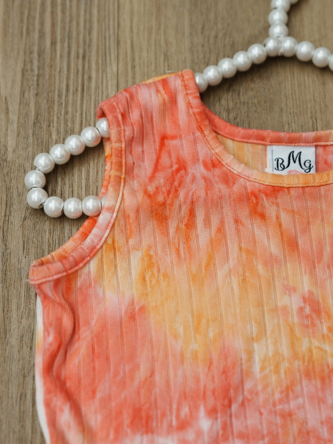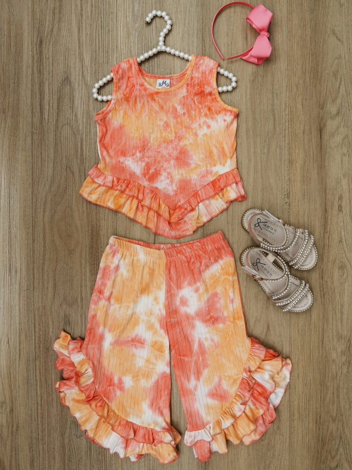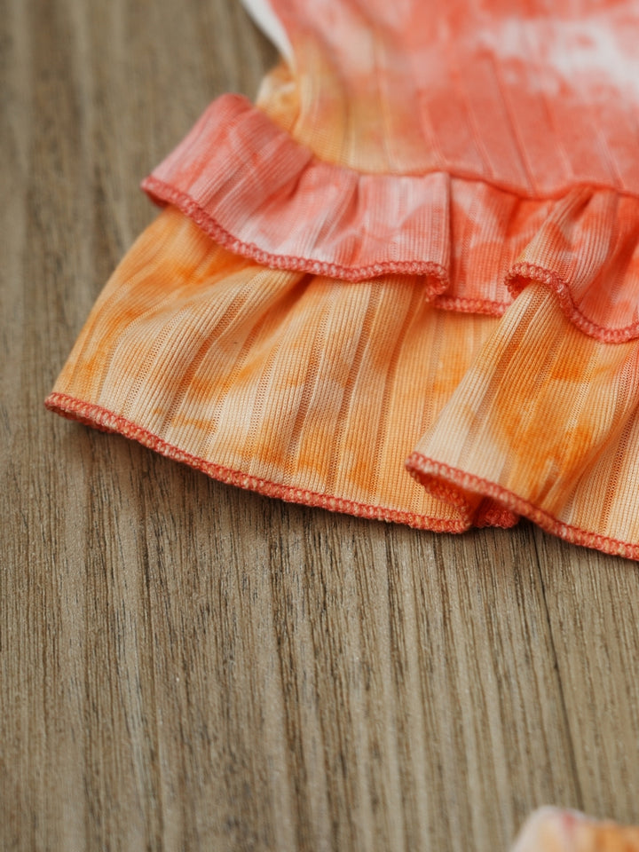 Brighten her day with this playful tie-dye set bursting with sunshine shades and flouncy ruffles. Perfect for lounging, playing, or twirling her way into summer fun.