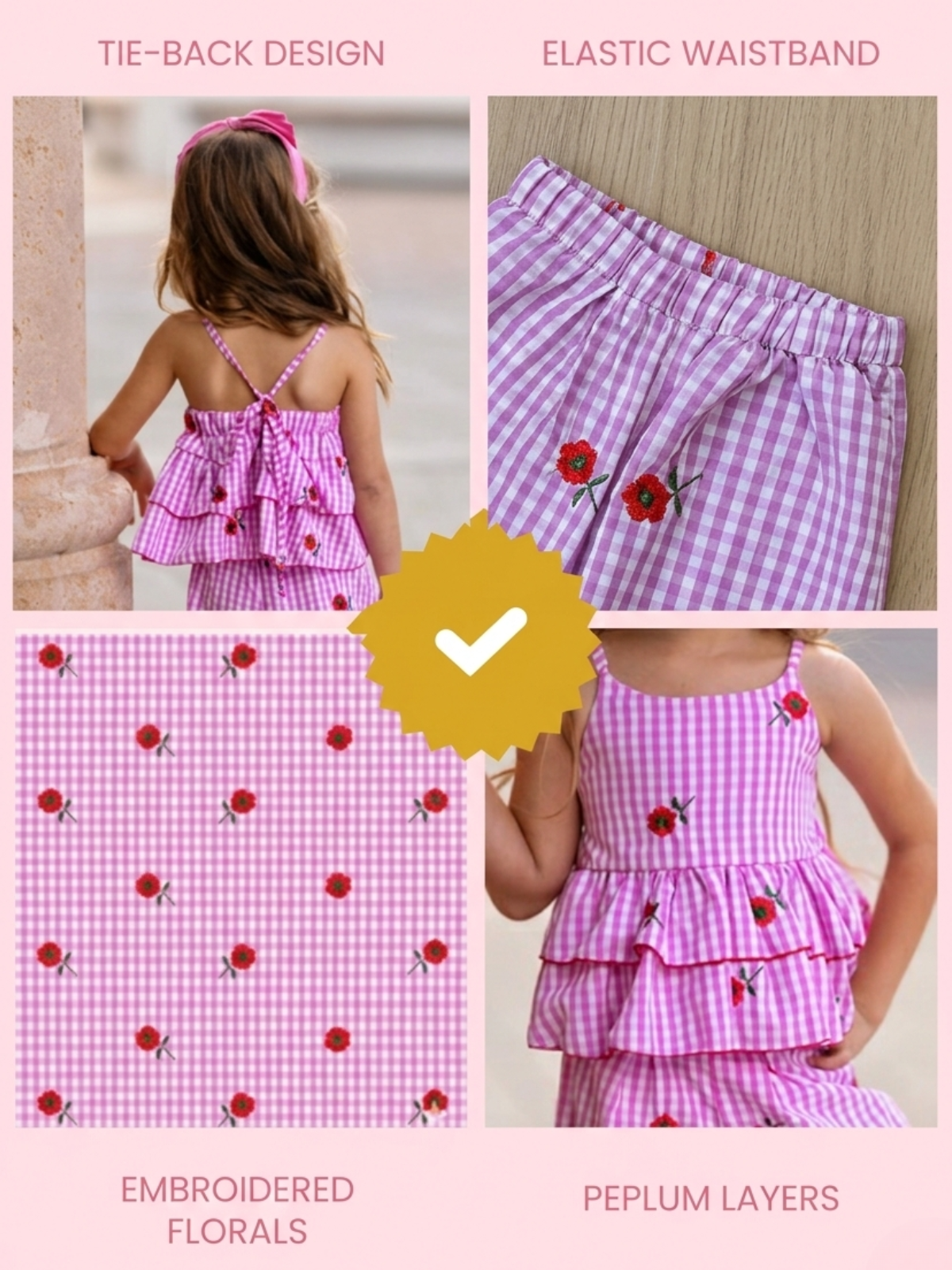 - Features a classic pink gingham peplum top accented with delicate floral embroidery for a boutique-inspired look