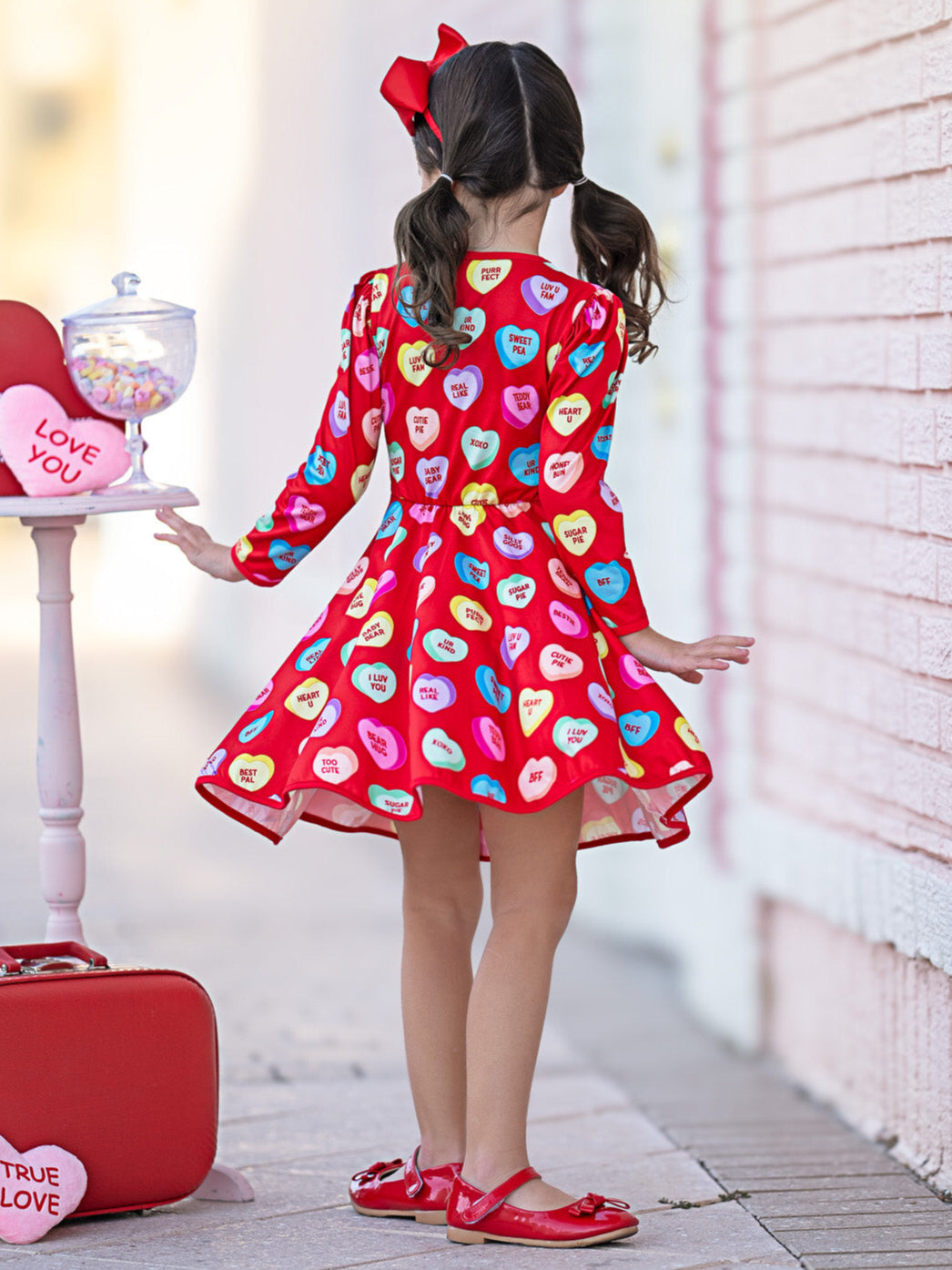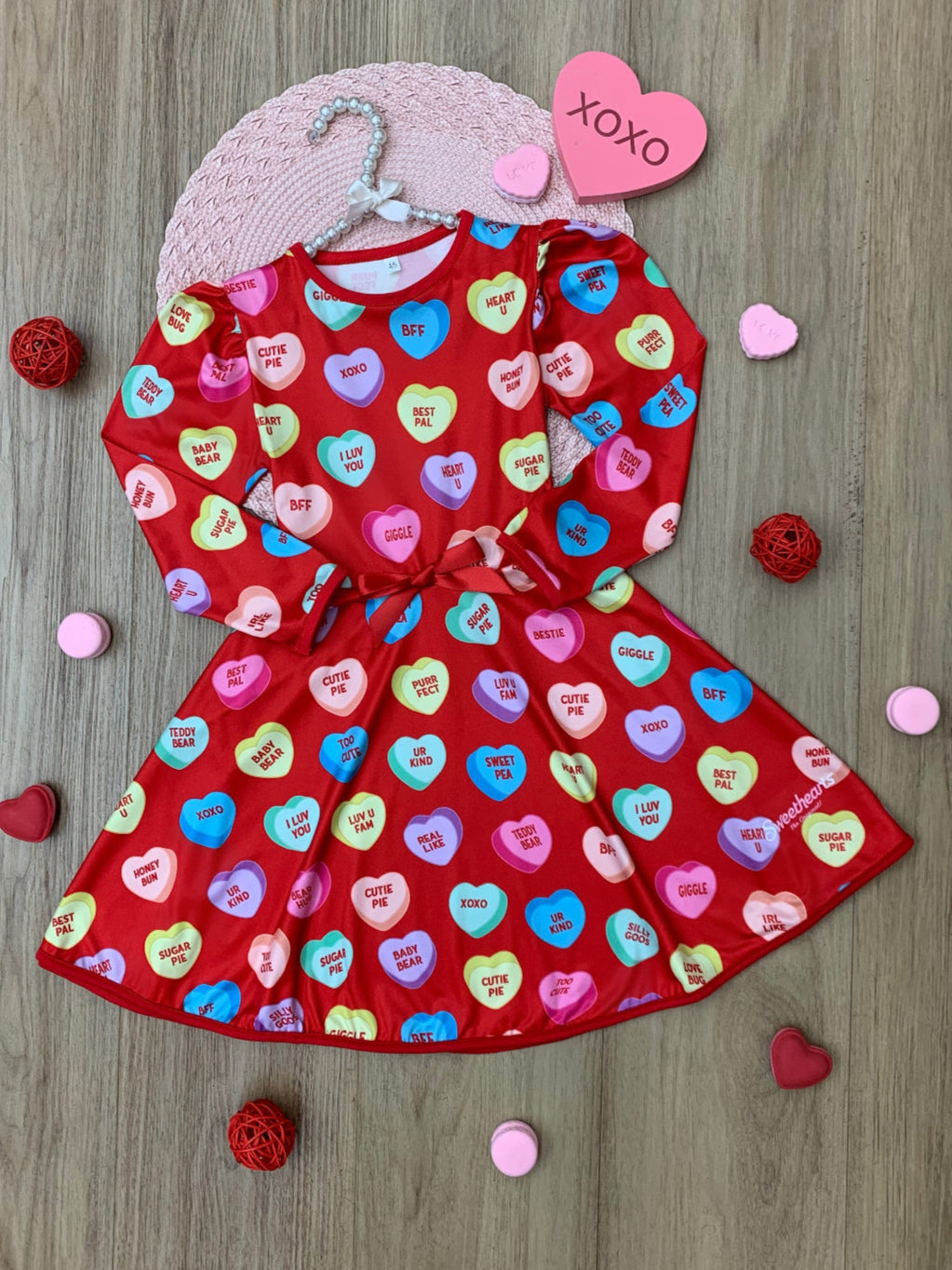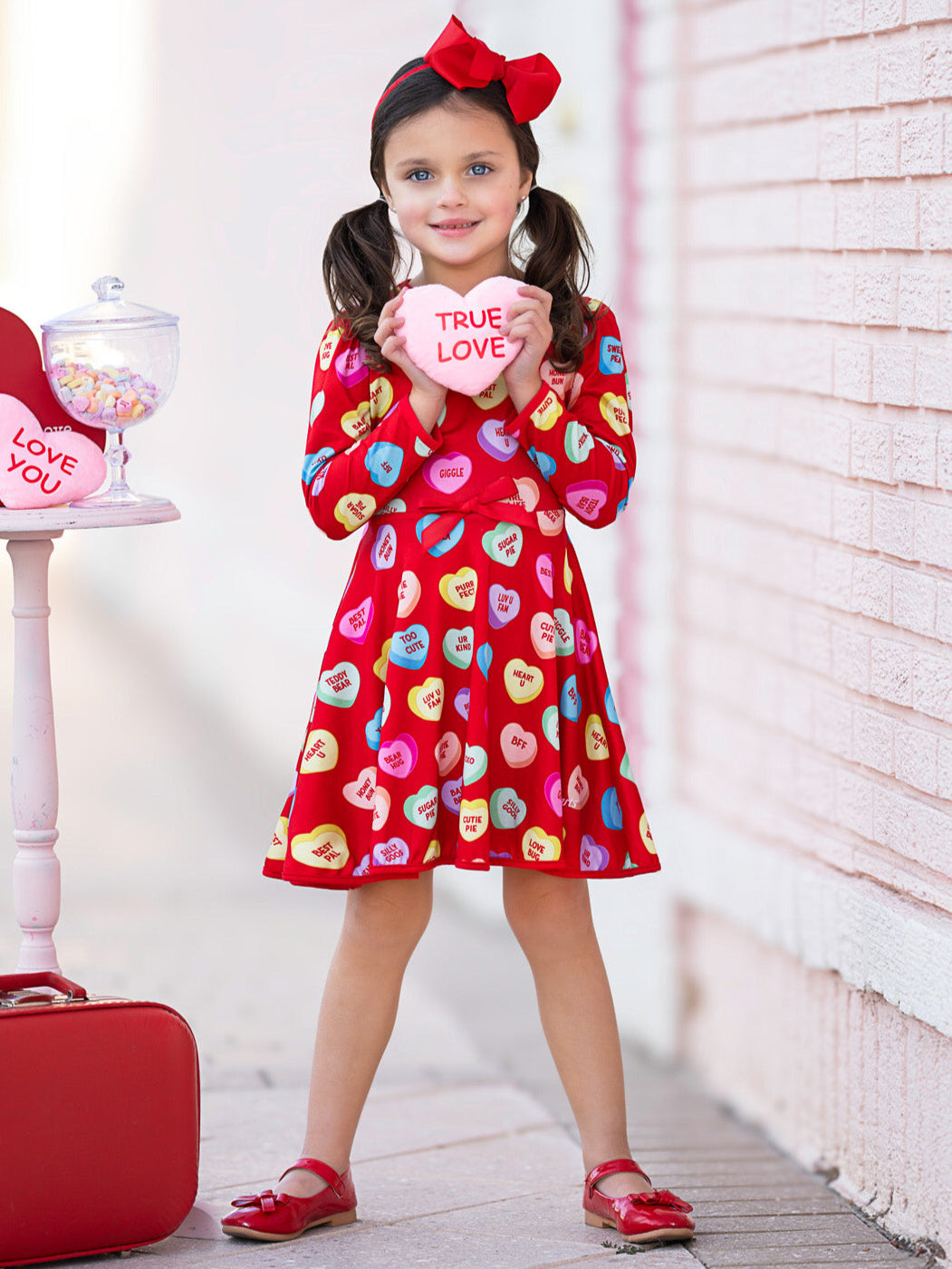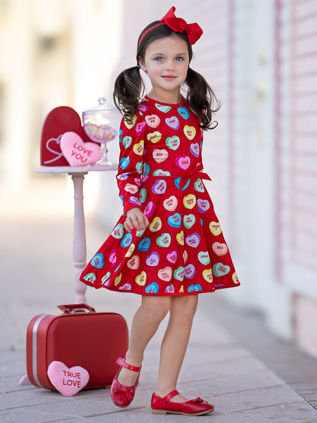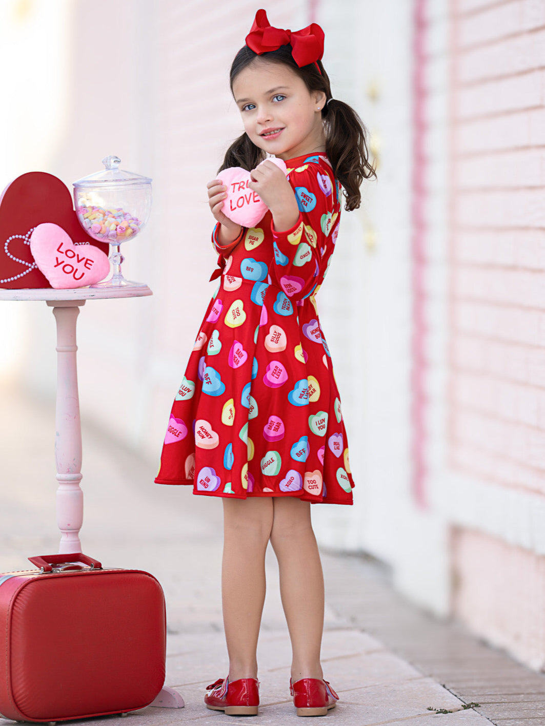 Red Sweethearts® dress with Conversational Heart phrases throughout with adorable accent bow