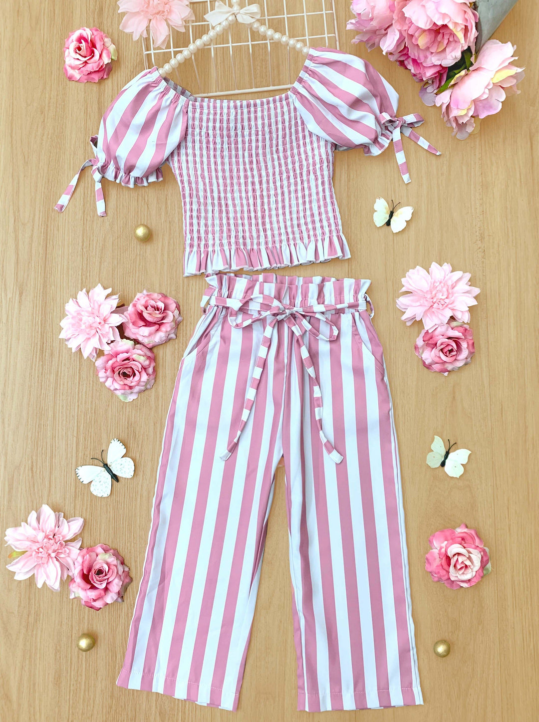 - For IT girls who love dressing up! This pink-striped pant set is just the perfect pairing to complete your little one's summer wardrobe. The top features a smock design with puff sleeves while the wide-leg pants offer an easy-breezy look that's so trendy for warm weather! Totally grab-worthy!