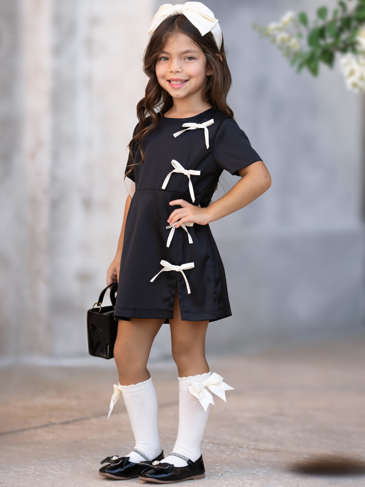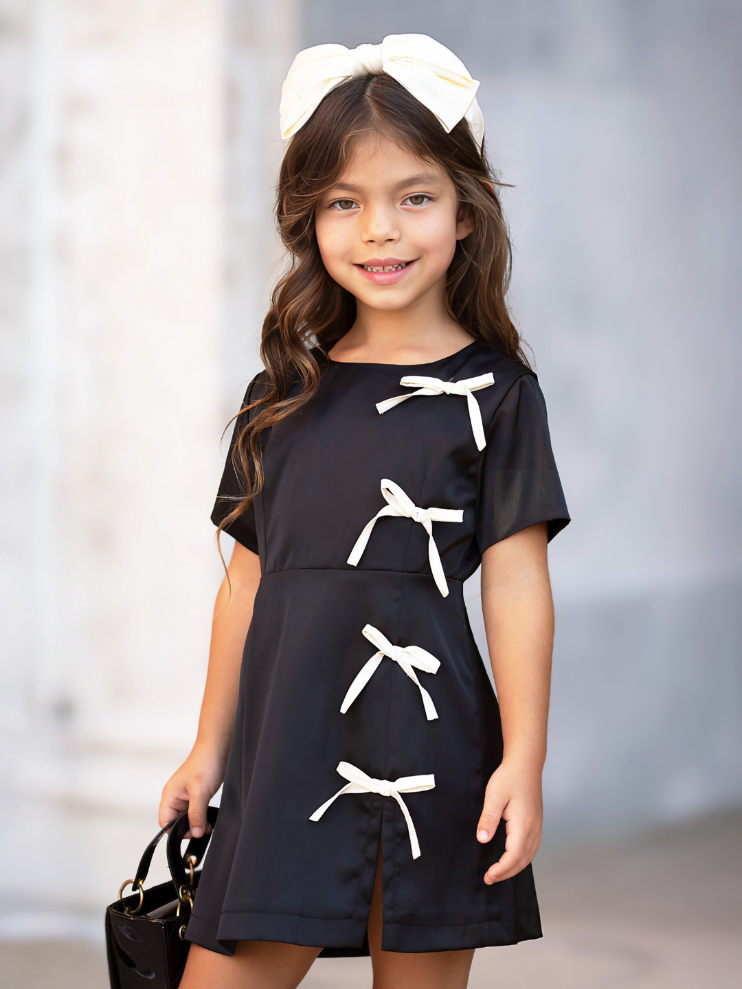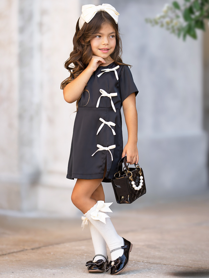Classic, modern, and irresistibly cute—this black shift dress with contrast white bows is a wardrobe must-have for your mini style icon.