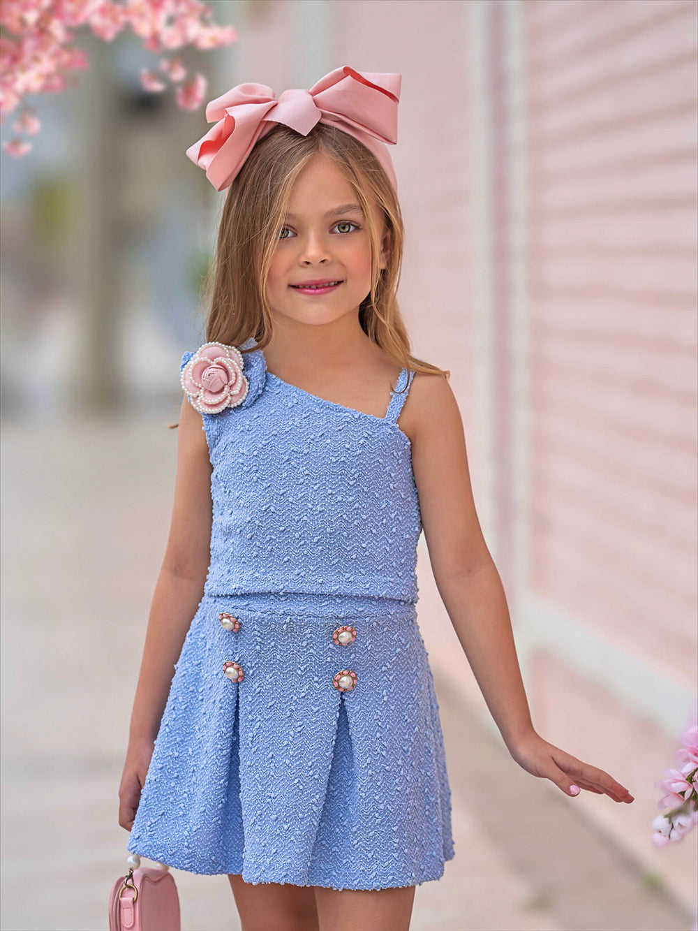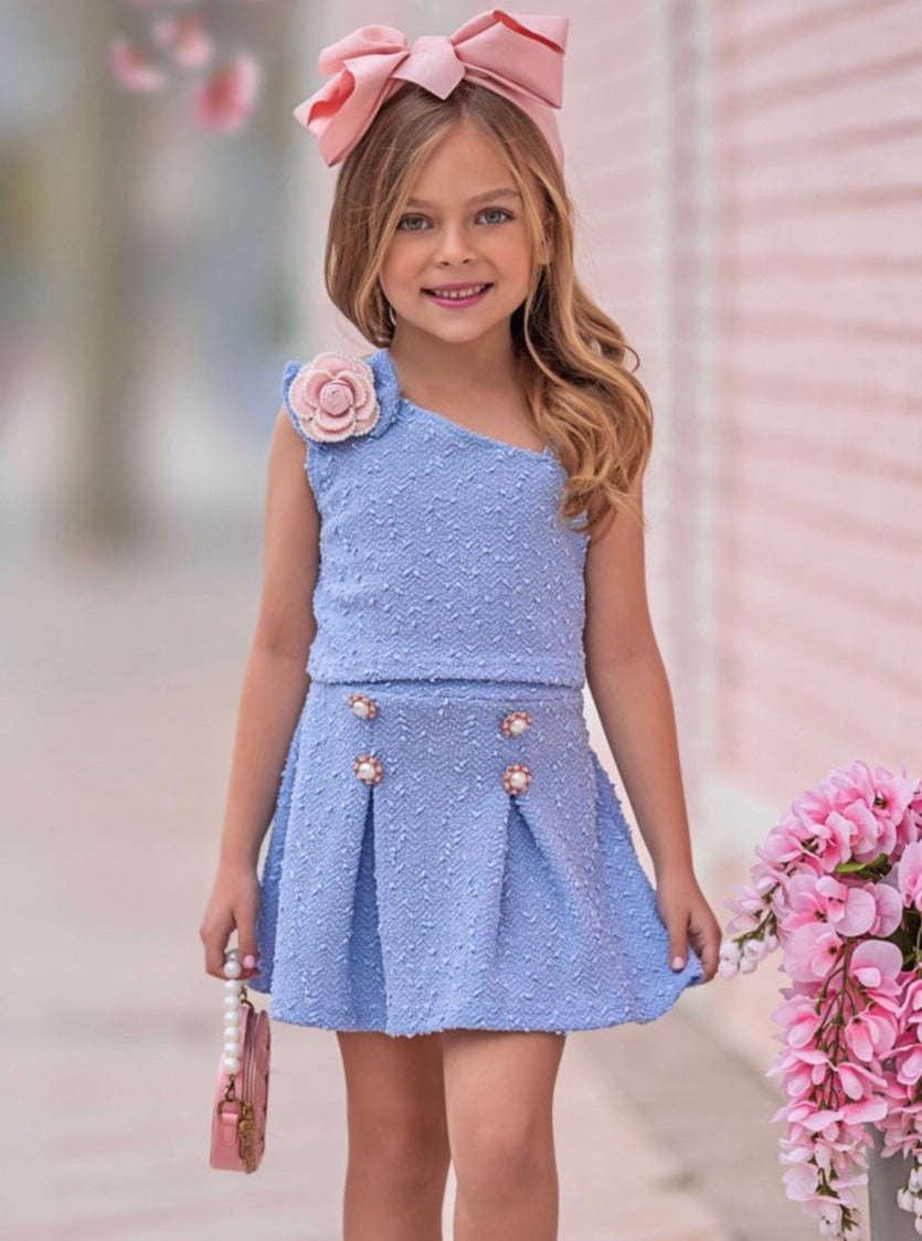 Set includes blue asymmetrical top with pearl-embellished statement flower and matching skirt with pleated details and flower button accents