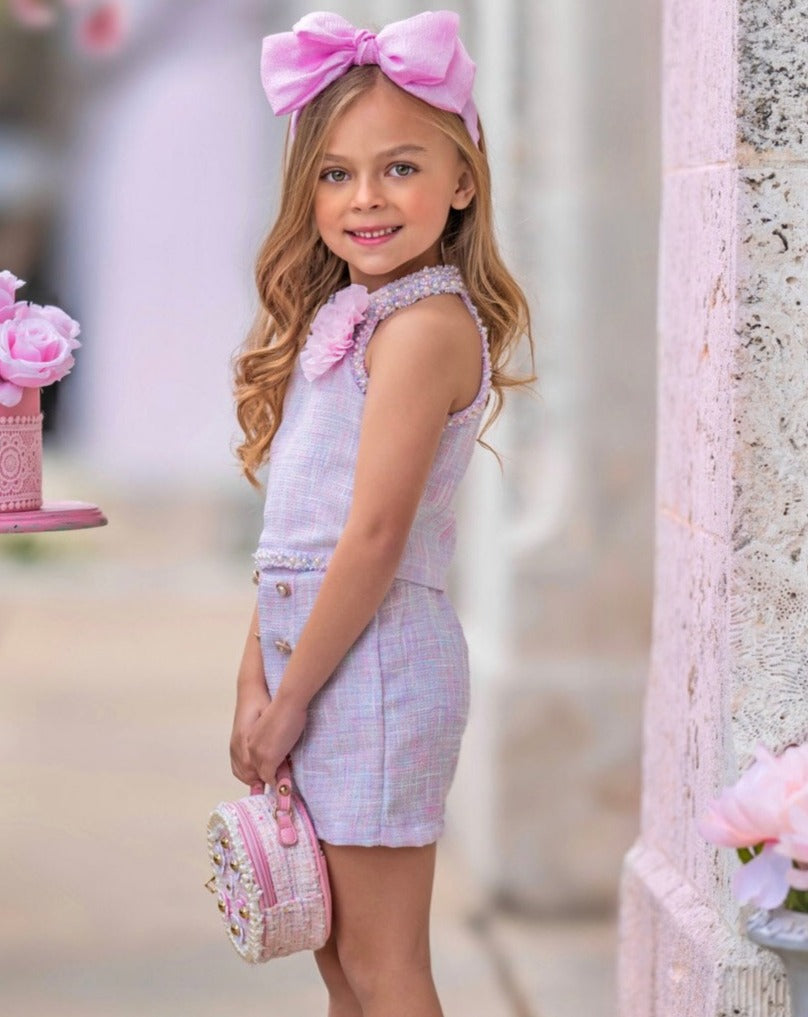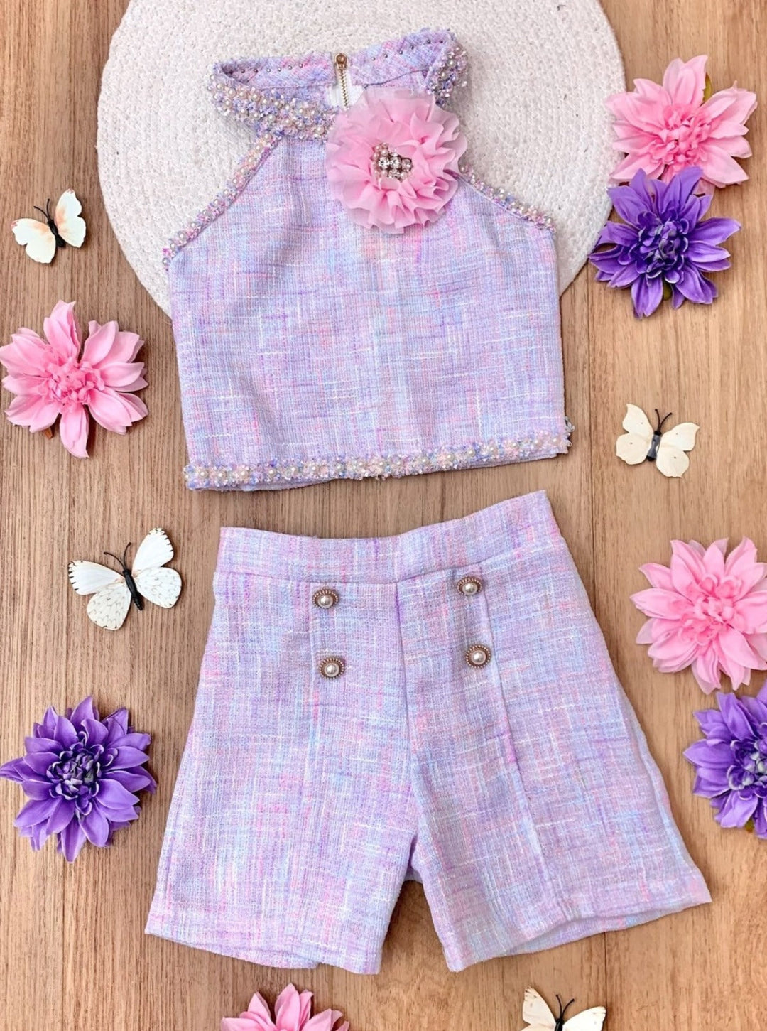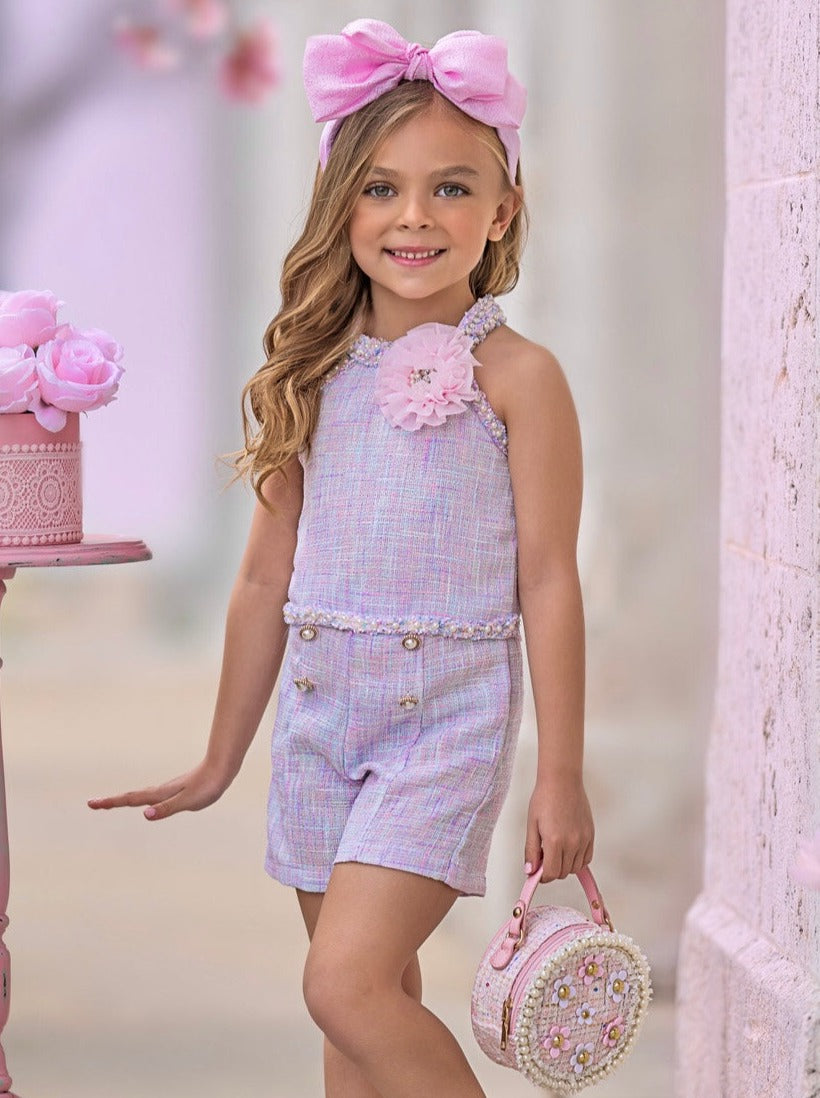- Cute and confident vibes are guaranteed with our pastel halter tweed top and short set. She'll be feeling springtime magic when she sees its pretty color, rosette detail, and pearly bling. Snap endless pics because she'll be looking photo-ready!