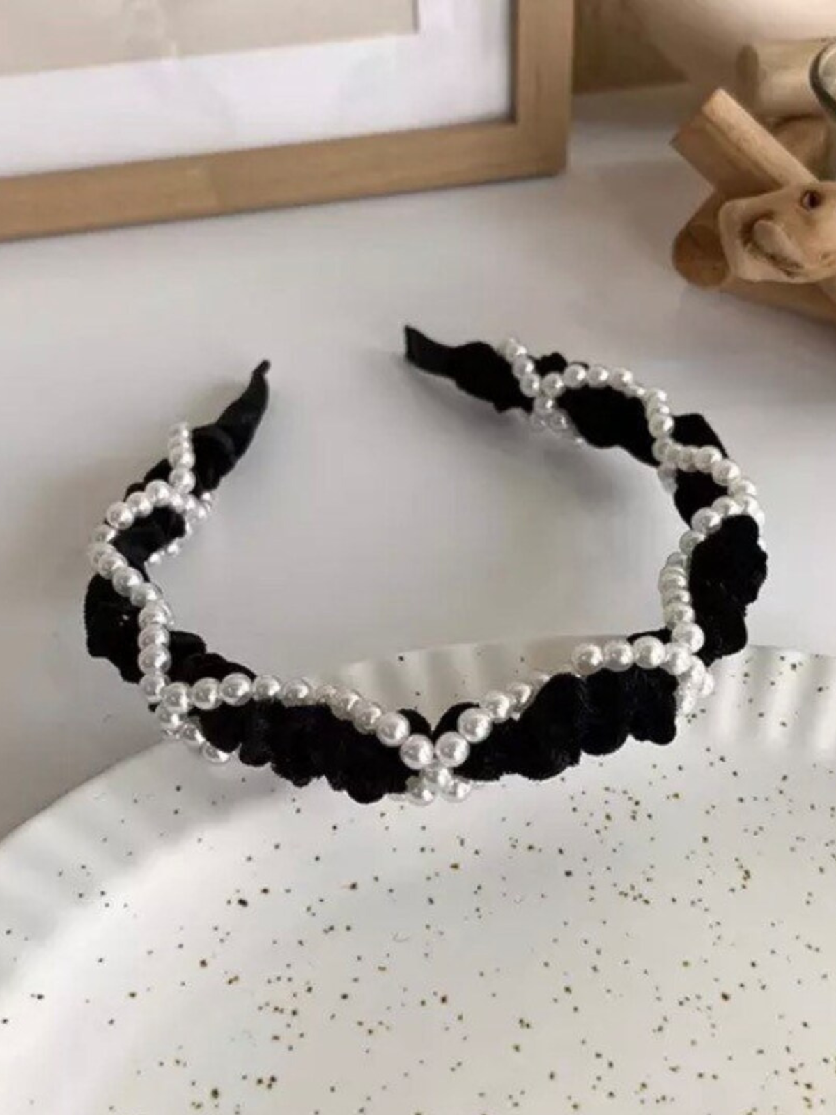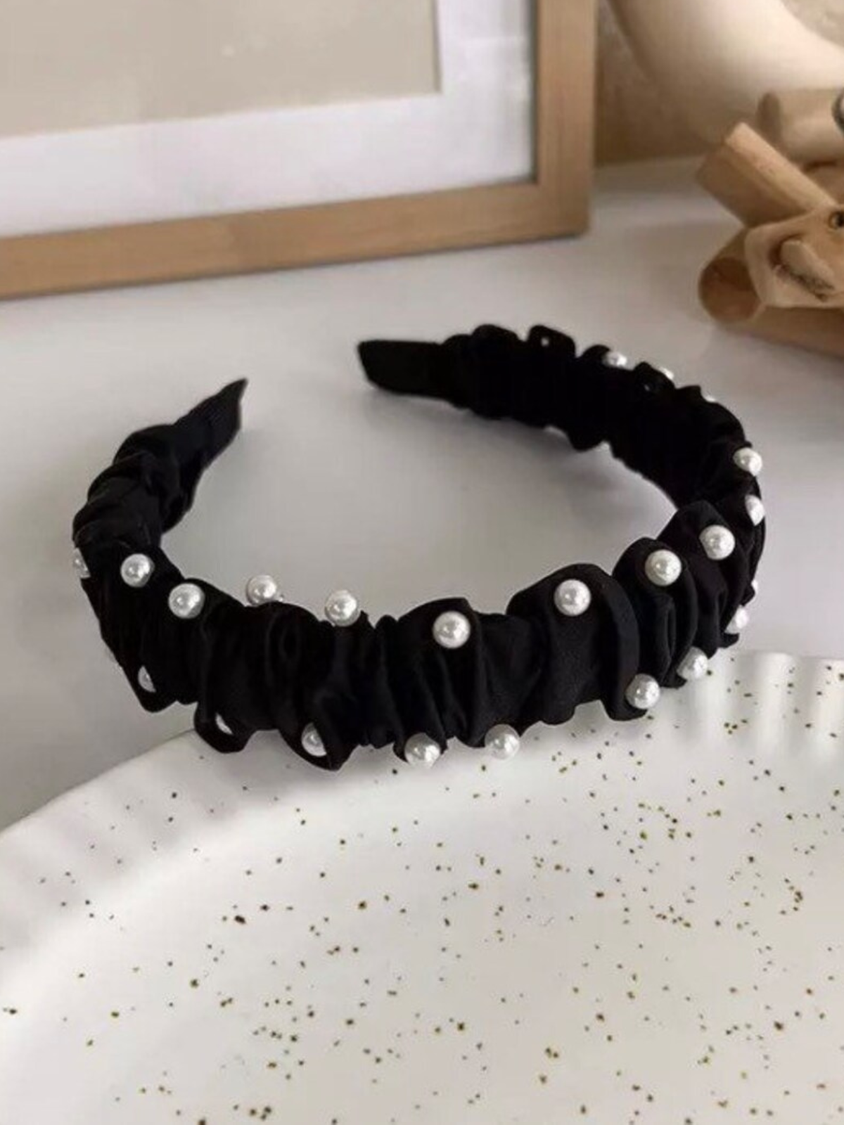 - Black padded headband with pearl embellishment